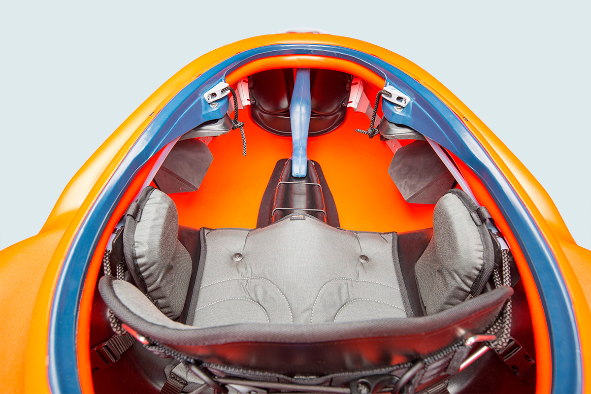 - Vnitřní výbara PRO: Ergonomicky tvarované a pohodlné sezení, ergonomické zrcadlo, stehenní podložky, boční opěrky a kolenní opěrky zaručují perfektní kontakt s lodí i při delší jízdě, vysoce odolná přední plastová vzpěra.