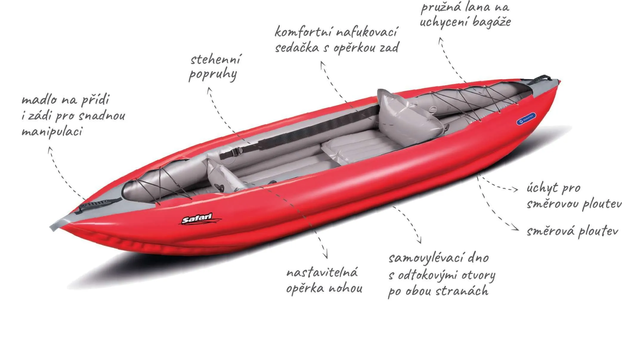 Šířka 80 cm v kombinaci s konstrukcí se šesti vzduchovými komorami a samovylévacím dnem zajišťuje výbornou stabilitu i v rozbouřené vodě. Odtokové otvory po obou stranách dna efektivně odvádí vodu z lodi, což je klíčové v peřejích nebo při větším zalití. Safari má tvarovaný trup s úchytem pro směrovou ploutev, která zlepšuje vedení lodi v klidnější vodě. Konstrukce trupu i rozložení sedu umožňují velmi dobrou kontrolu v technických pasážích i pří surfování. Kombinace stability, ovladatelnosti a bezpečnosti dělá ze Safari spolehlivého partnera na vodě.