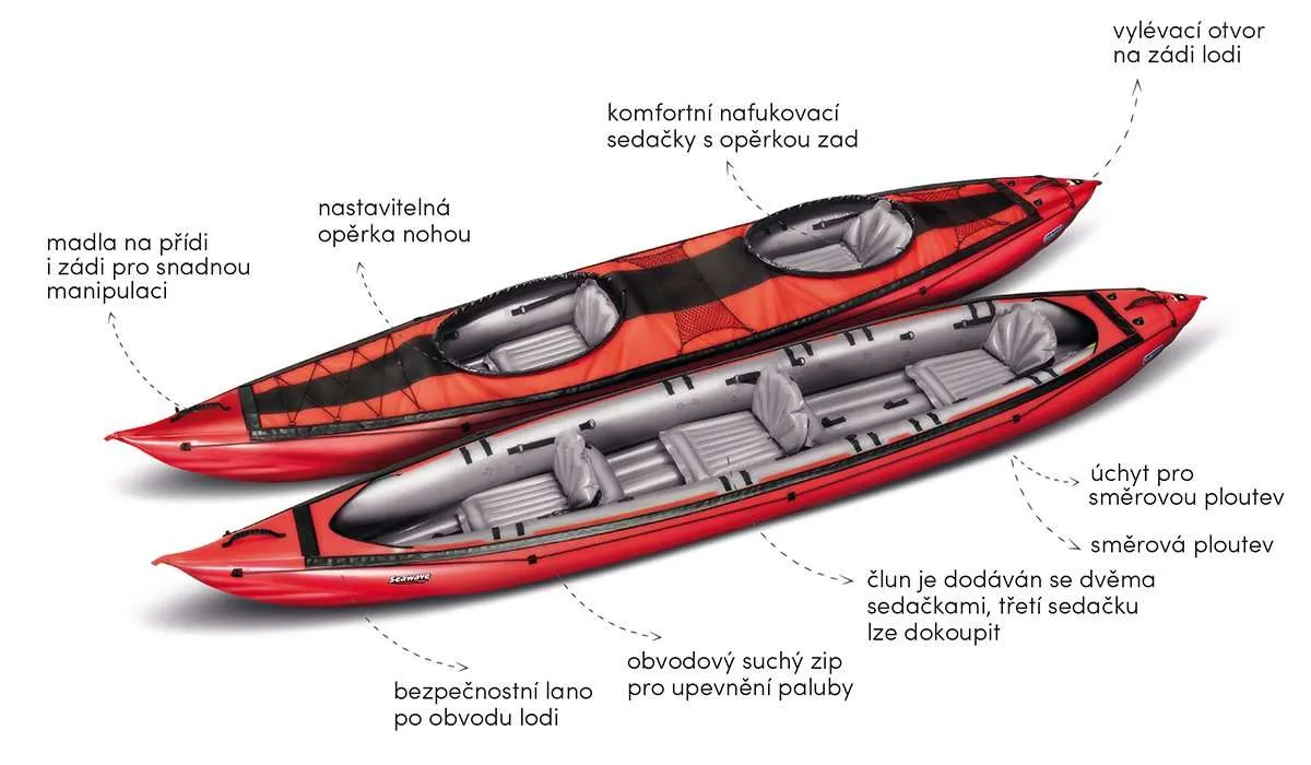 - 2 komfortní sedačky – nafukovací, s opěrkou zad a možností úpravy sklonu