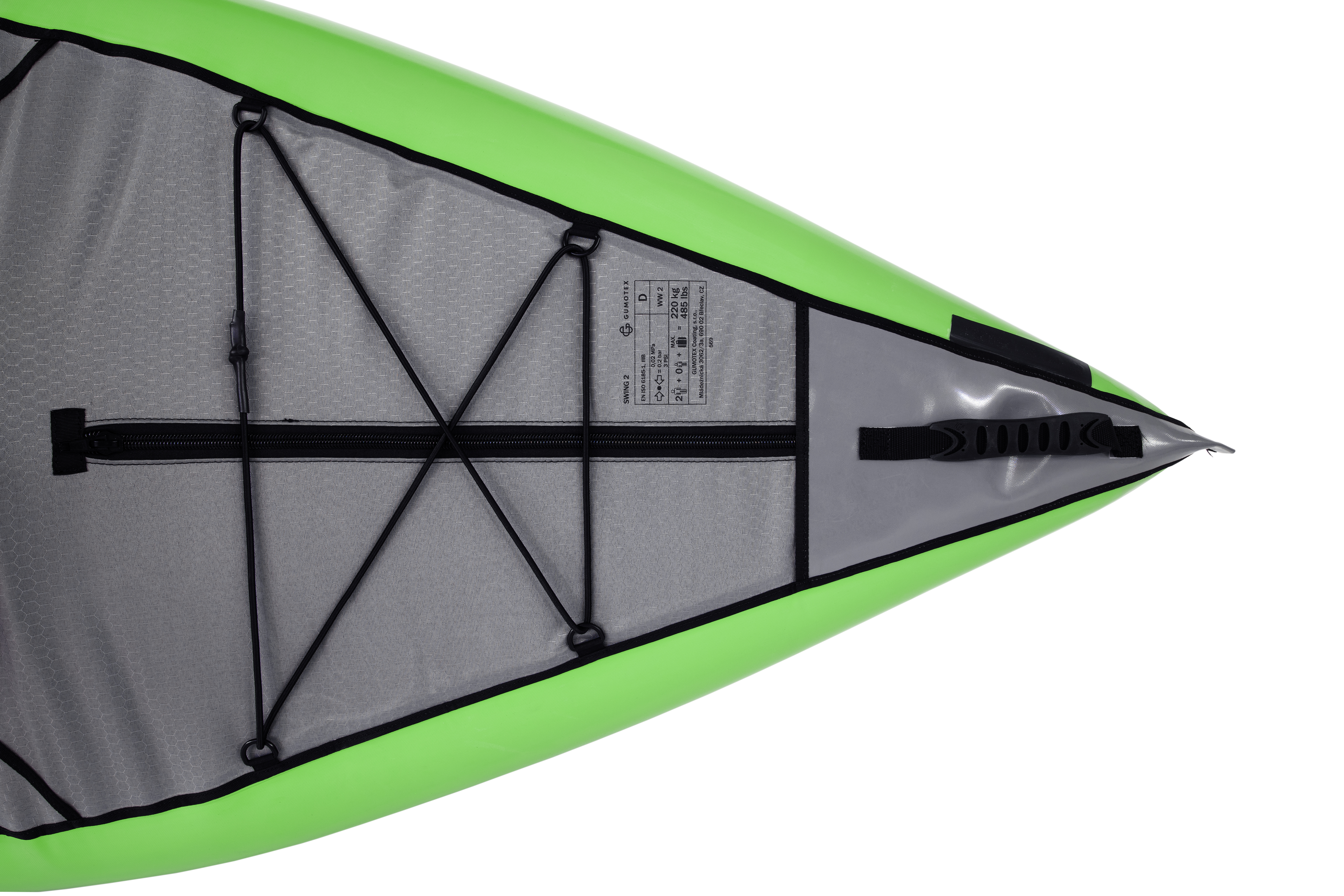 Gumotex Swing 2 (402 × 87 cm, 14,3 kg, nosnost 220 kg) je uzavřený dvoumístný kajak určený pro rekreační pádlování a turistiku. Díky nízké hmotnosti a stabilnímu trupu je vhodný i pro méně zkušené jezdce, kteří hledají pohodlnou, bezpečnou a dobře ovladatelnou loď pro výlety po klidných řekách, jezerech či mořských zátokách. Výztuhy v konstrukci zajišťují dostatečnou tuhost a směrovou stabilitu, což přispívá k příjemnému pocitu z jízdy i ve dvojici. Samozřejmostí je snadná manipulace a rychlé sbalení do transportního vaku.