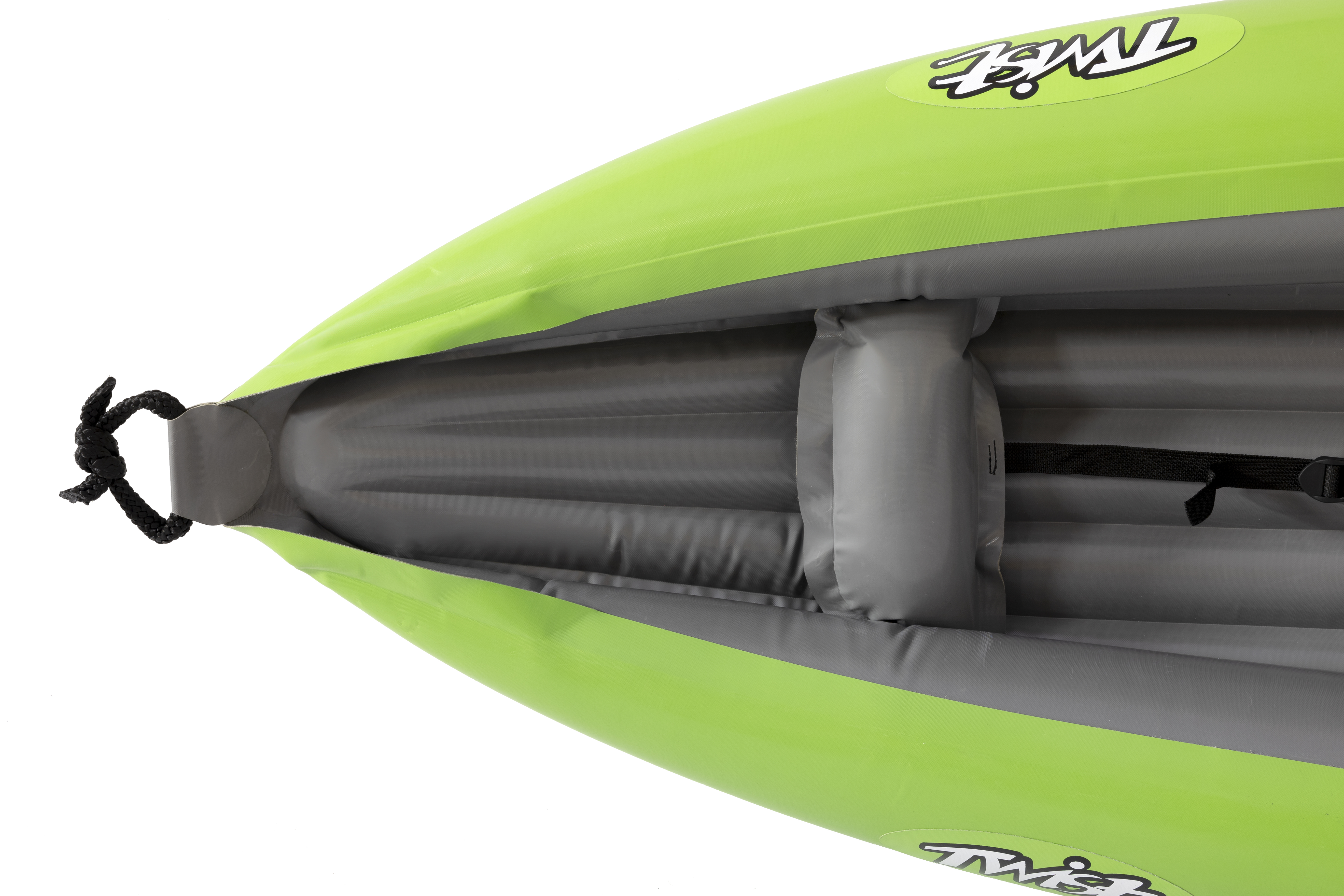 Twist 1 (260 × 79 cm, 7,4 kg, nosnost 100 kg) je kompaktní jednomístný nafukovací kajak určený pro rekreační plavby na jezerech a klidných řekách. Díky stabilnímu trupu, nízkému profilu a směrové ploutvi drží směr a snadno se ovládá. Komfortní sedačka s opěrkou zad zaručuje pohodlí i při delších výletech a vícestupňová opěrka nohou umožňuje individuální nastavení. Nízká hmotnost usnadňuje přenášení a přepravu.