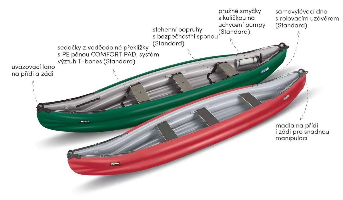 - Kánoe: Nafukovací kánoe Scout – červená nebo zelená