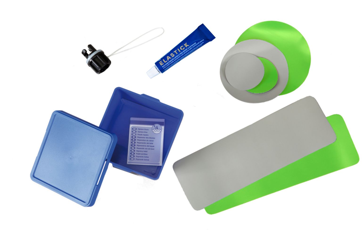 Složení: tuba 15g s lepidlem, náhradní záplaty, upravená redukce push-push ventilu, šroub s maticí na sedačky.