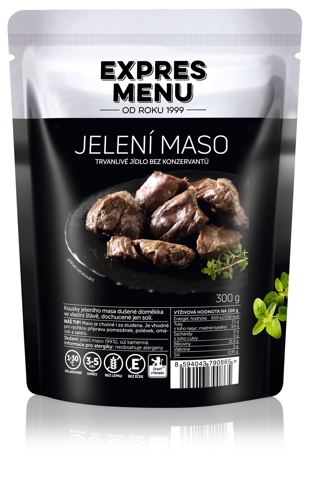 Kousky jeleního masa dušené doměkka ve vlastní šťávě, dochucené jen solí. Maso je chutné i za studena. Je vhodné pro rychlou přípravu pomazánek, polévek, omáček a salátů.