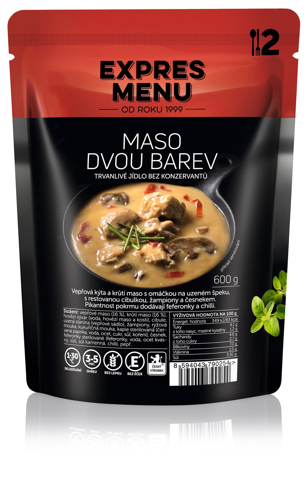Vepřová kýta a krůtí maso s omáčkou na uzeném špeku, s restovanou cibulkou, žampiony a česnekem. Pikantnost pokrmu dodávají feferonky a chilli.