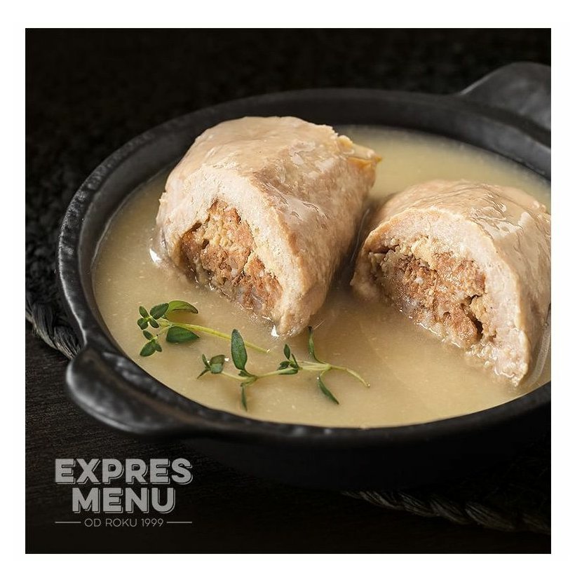 Jedna vydatná porce rolády z vepřového masa ručně plněné vaječnou fáší s kousky klobásy v jemné omáčce z restované cibule, hořčice a vajec tvoří ideální chuťovou kombinaci s celozrnnou rýží