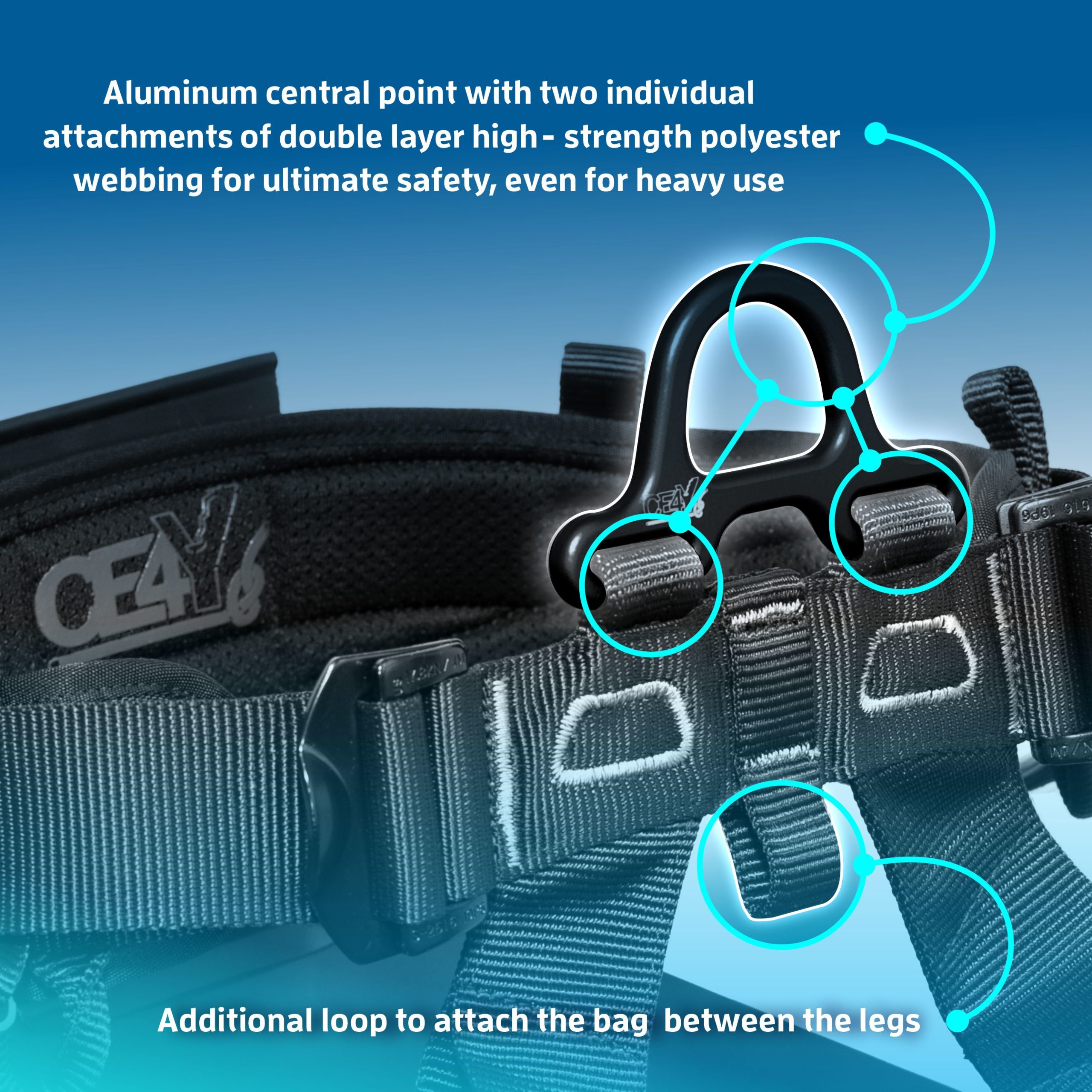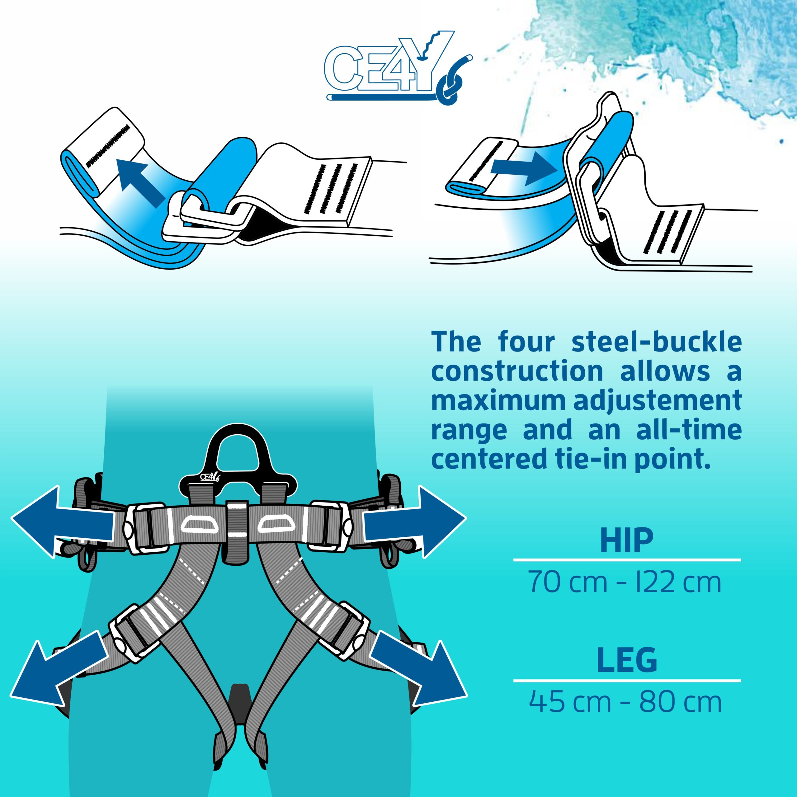 - 4 spony umožňují optimální a snadné nastavení a místo pro připojení lana zůstává vždy uprostřed