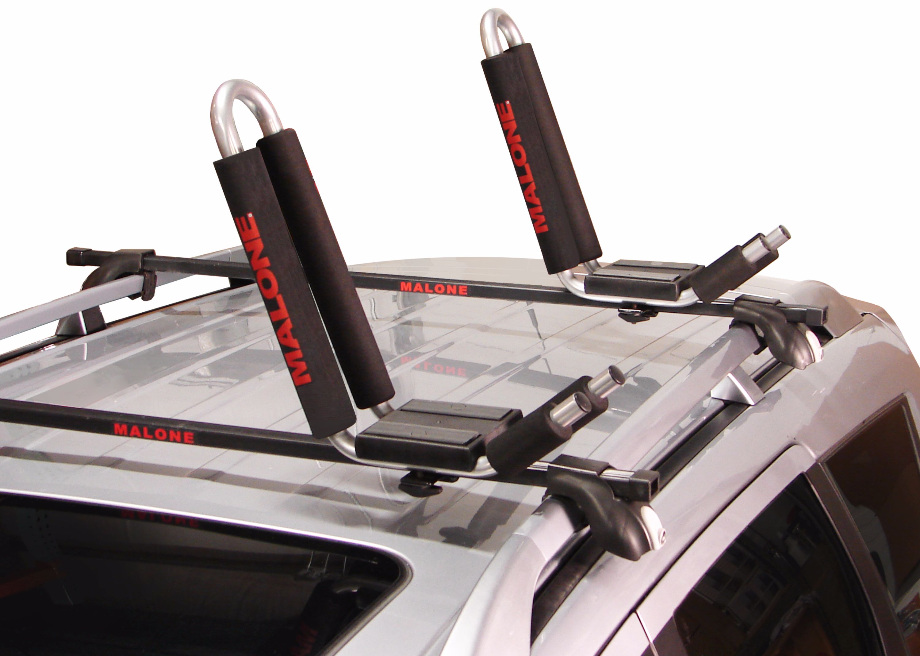 Propracovaný střešní nosič Malone J-Pro2 ve tvaru J, ideální pro bezpečný transport lodí na střeše auta.