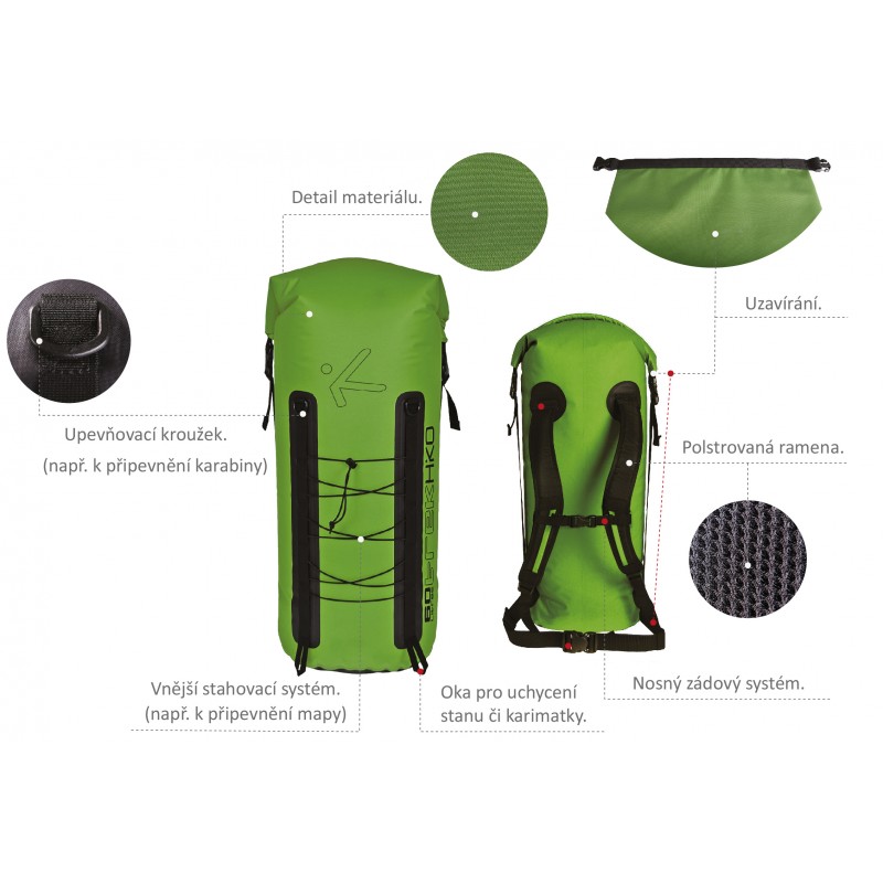 TREK Backpack je kombinace suchého vaku a batohu vyrobená z odolné nylonové tkaniny s TPU zátěrem.