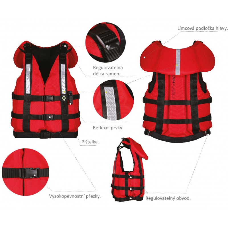 - Nezbytnou součástí vesty je límec poskytující ve vodě, v poloze na zádech oporu hlavy.